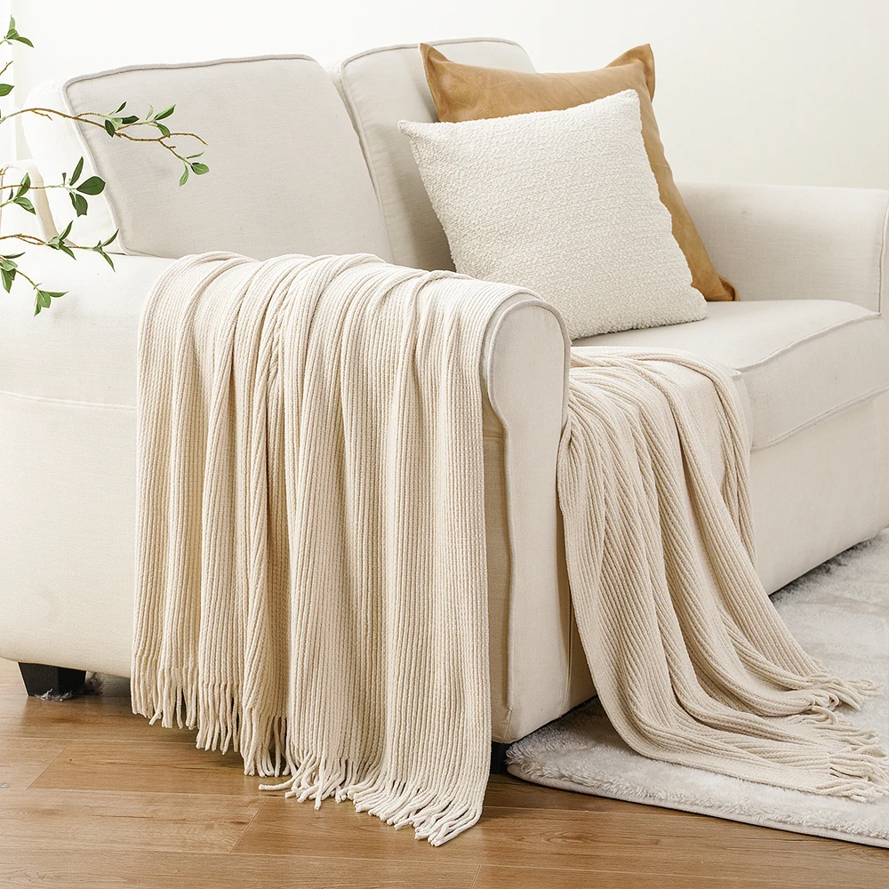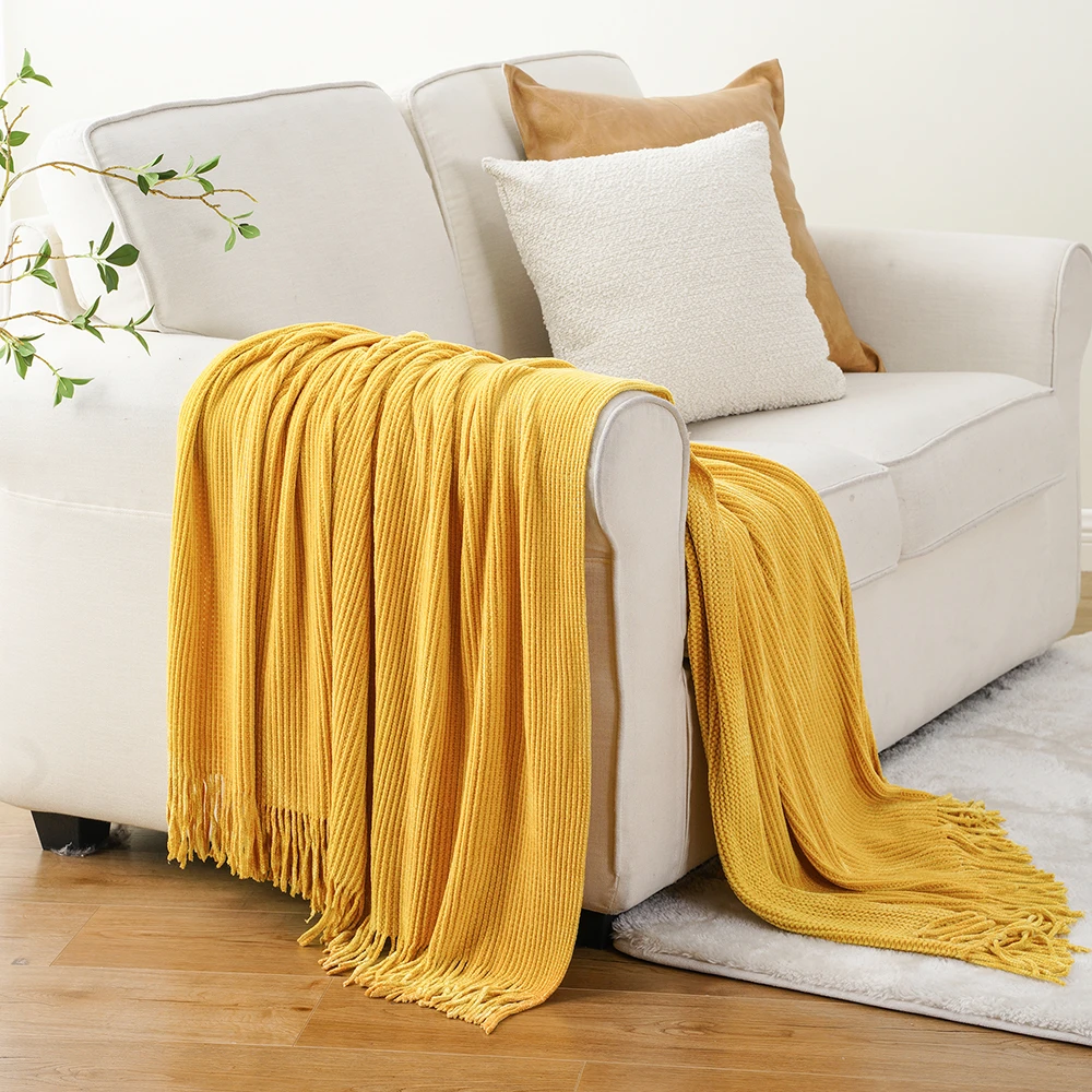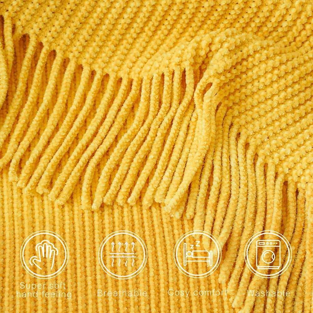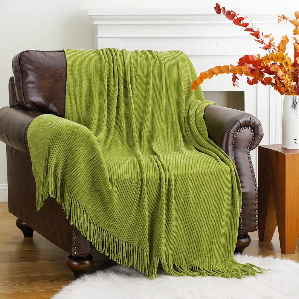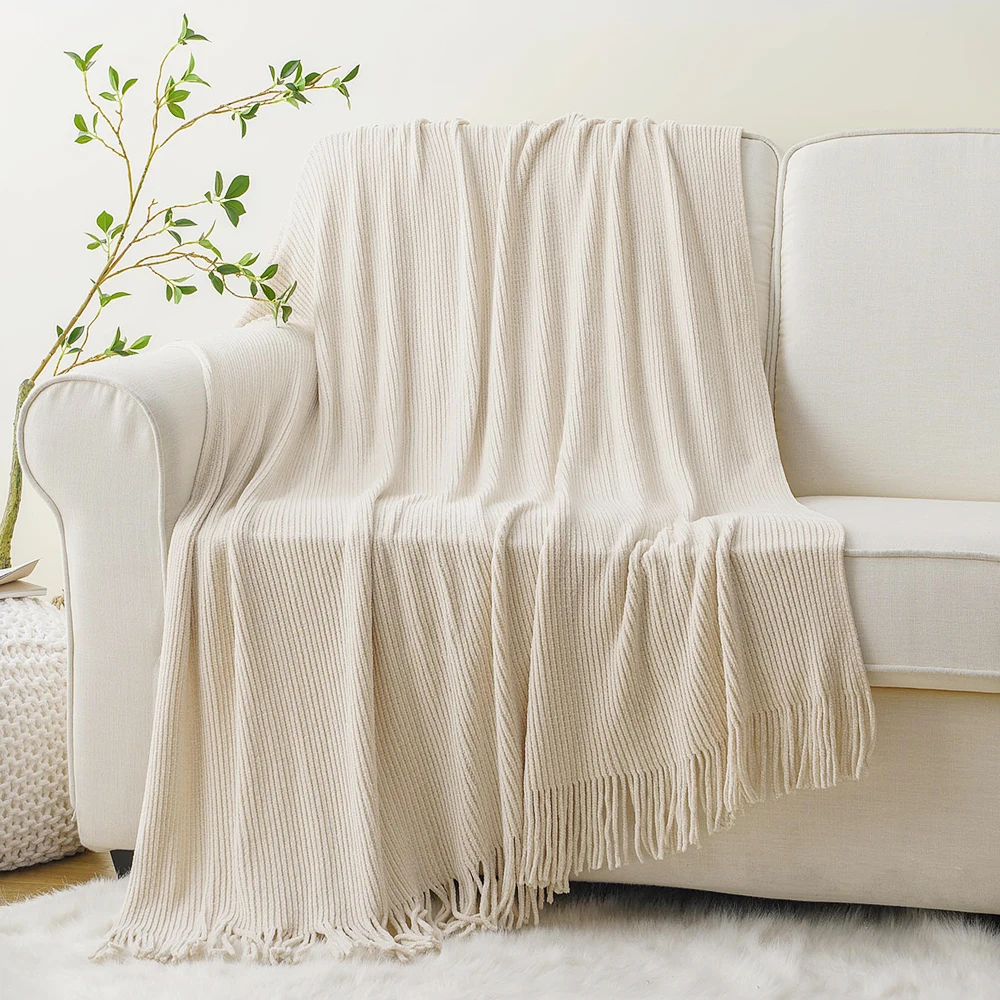 Plaid en chenille douce avec pompons – Couverture tricotée décorative pour lit et canapé